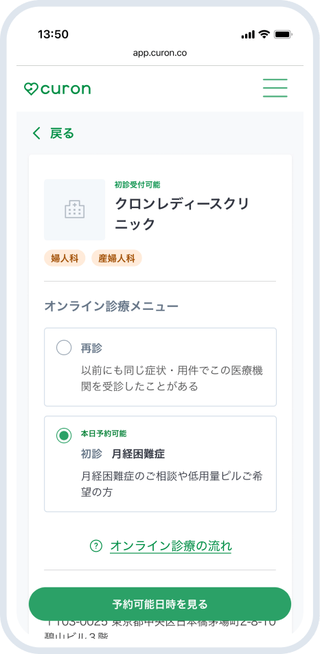 医師がオンラインにて診療可能と判断した場合、行っていただくことが可能です。初診でのオンライン診療を受け付けている医療機関は、こちらのページより「初診受付可能」にチェックを入れて検索ください。