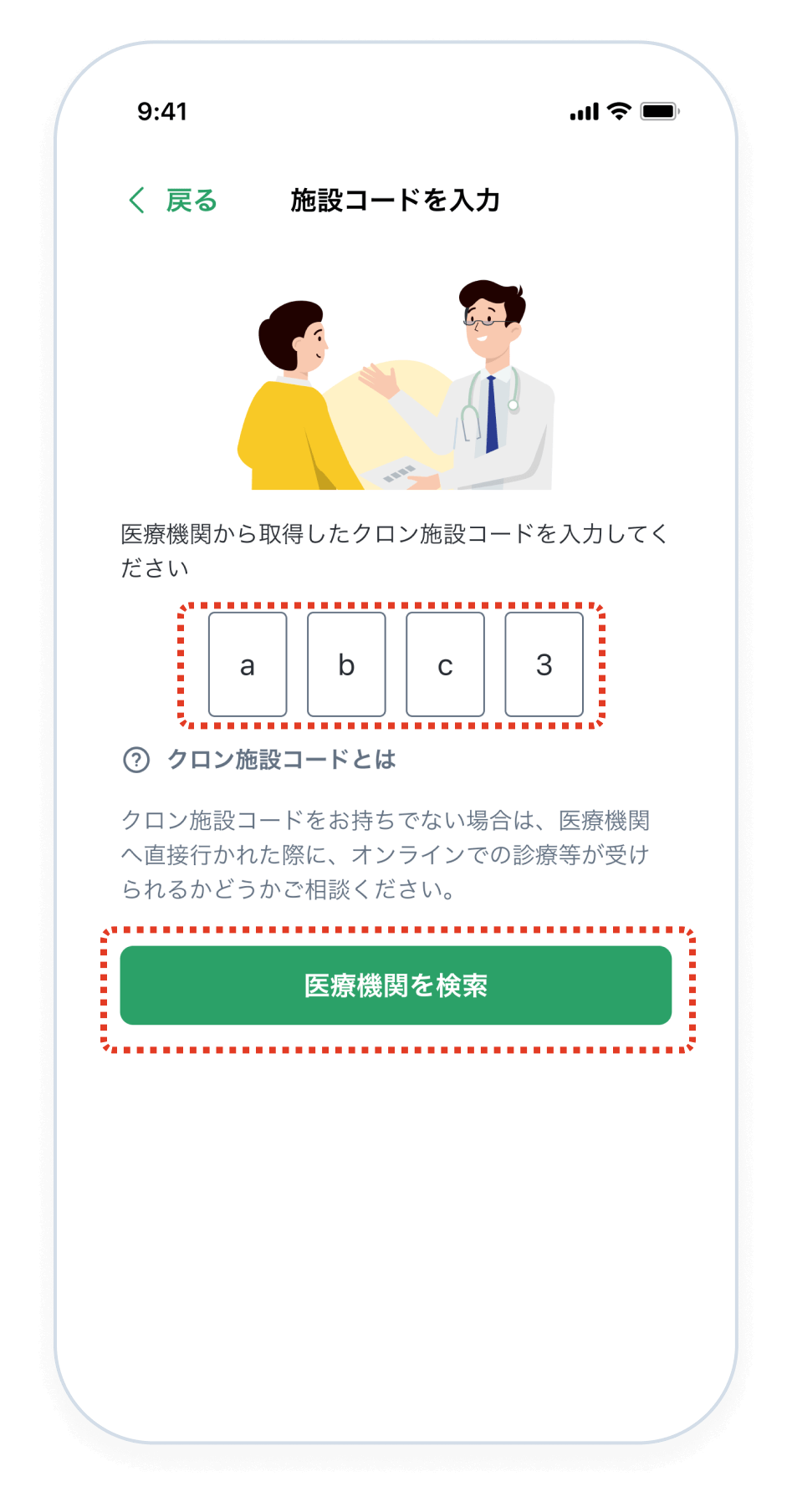 かかりつけの医師からクロンを使ったオンライン診療を承諾されている場合は、病院・クリニックから4桁のクロン施設コードを受け取ってください。