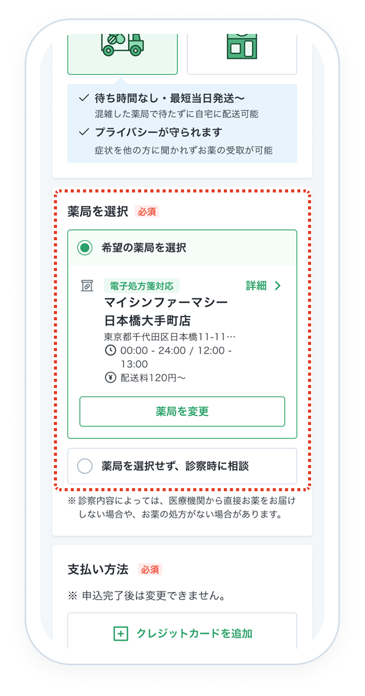 診療代金やお薬・処方箋の配送料などのお支払いはクレジットカード(VISA, MasterCard, JCB, AMEX, Diners)で決済いただけます。